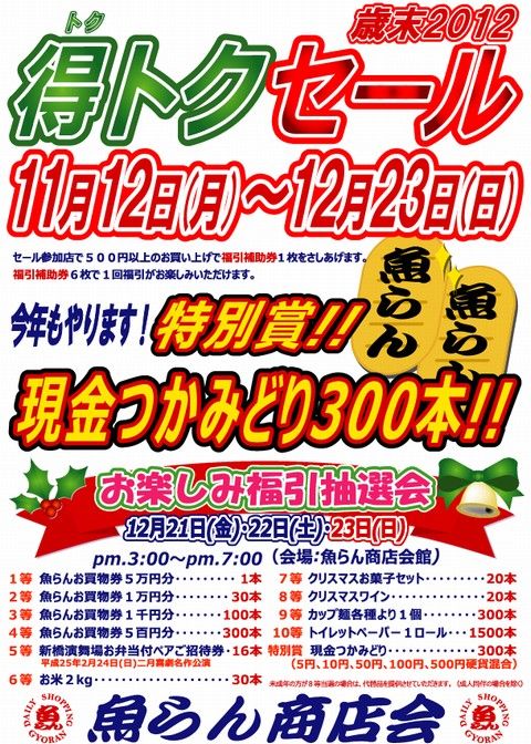 本日(11月12日(月))より来月23日(日)まで、歳末2012・魚らん得トクセールが始まりました。
