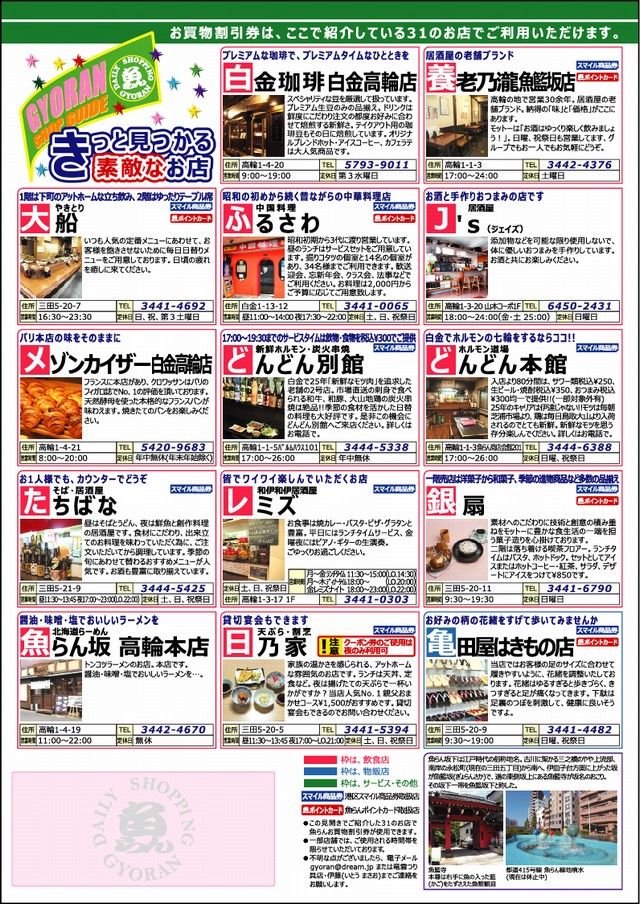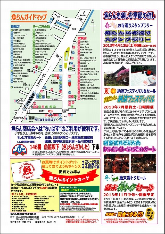 チラシがお手元にある方には、ささやかながらお買物割引券(クーポン券)をお付けしてあります。チラシ見開きに掲載しました31のお店で使用できますので、少々遠方の方もちぃばす等公共交通機関を利用して、魚らん商店会にお越しください。