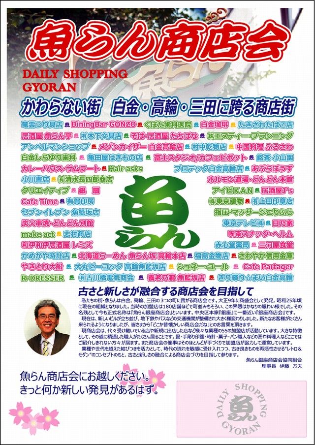 4月になり新年度、新学期と皆さまの生活にも何らかの変化がある時期に、“かわらない街(商店会)”と称してチラシをお配りするあたり魚らんらしいなぁ!と思ってご覧いただければ幸いです。